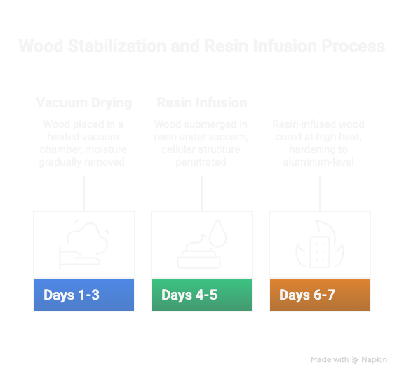 Our tempering process increases wood density three-fold, creating material with hardness rivaling aluminum while maintaining natural beauty.